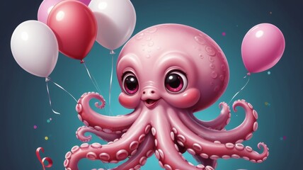Adorable pink octopus cartoon character celebrates with festive balloons for a fun birthday party, adding joy and whimsy to any design project with its cute charm