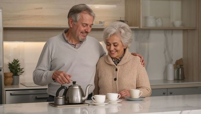 Senior couple making tea at modern kitchen island smiling together over warm teacups cozy
