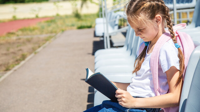 Elementary school girl or school pupil is studying, preparing to lesson, reading book or textbook outdoors at campus with backpack