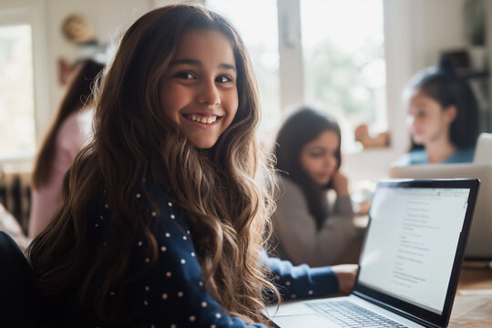 Smiling Young Girl Using Laptop in Classroom Setting with Friends, Engaged in Learning and Technology.