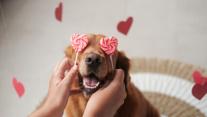 Valentines Day dog. The hands of a young woman substituted two lollipops in the shape of red hearts for a dog of the Golden Retriever breed instead of eyes. Dog and lollipop heart shaped banner.