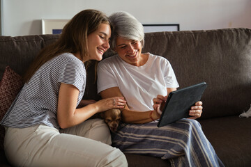 Hug, grandma or happy kids on a sofa with love enjoying quality bonding time together in family home. Smile, affection or senior grandmother relaxing with young children siblings on house couch