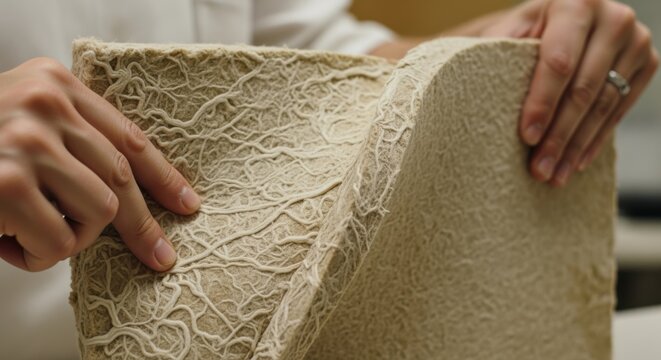 Hands carefully handling a semicured mycelium insulation panel demonstrating texture and firmness changes during curing.