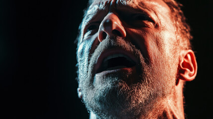 Intense actor expression during dramatic monologue rehearsal, showcasing emotion and passion. close up highlights facial details and lighting effects