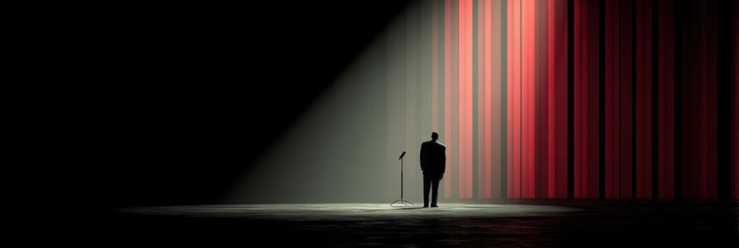 Spotlight shines on a performer waiting to deliver a powerful monologue in an empty theater during a dramatic evening showcase