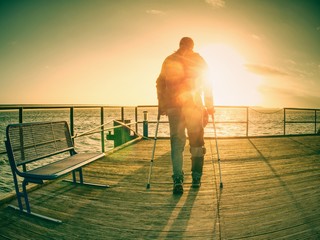 Lens defect. Hiker with medicine crutch and leg fixed in immobilizer walk