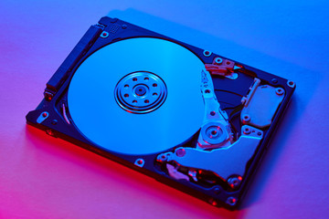 Disassembled hard drive from the computer, hdd with neon light. Opened hard drive Part of computer or laptop