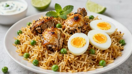 Top view of halved hardboiled eggs seasoned with pepper and rosemary sprigs arranged on a vibrant yellow background, a healthy proteinrich breakfast option