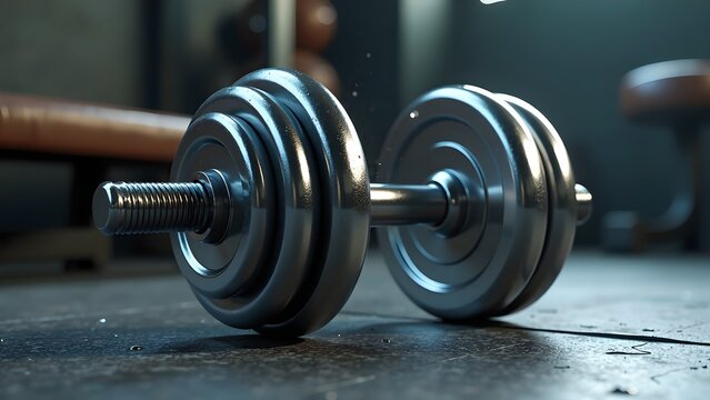 Silver Dumbbell on Dark Concrete Floor in Gym with Moody Lighting