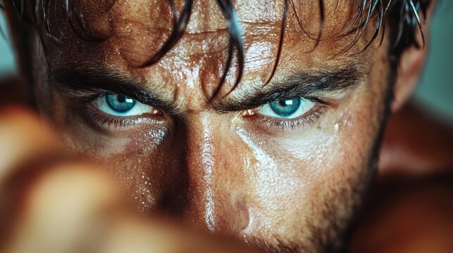 Close-up portrait showcasing a man's intense and determined expression, enhanced by striking blue eyes and a weathered look, embodying grit and raw strength.