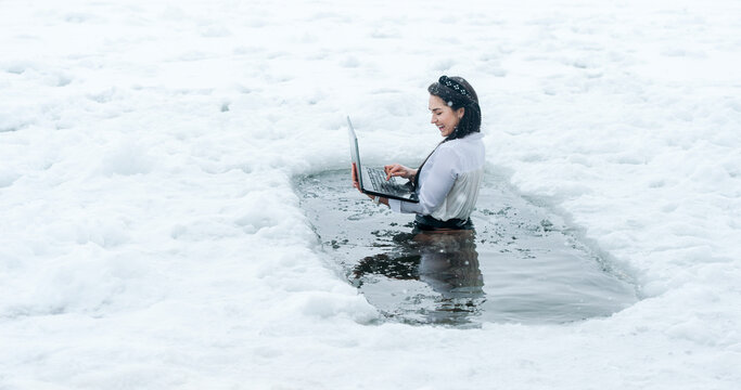 Girl with laptop in frozen lake ice hole. Woman hardening the body in cold water. Good immunity is protection against many diseases.