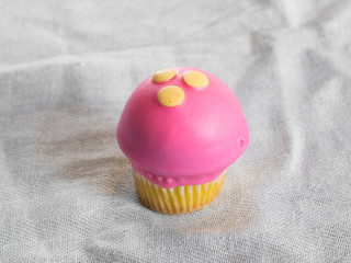 Homemade cupcake with a hardshell sugary frosting. A tasty and small dessert treat.