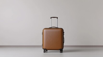 Brown hardshell suitcase with an extended handle and wheels standing upright on a light floor against a plain wall, ready for travel.