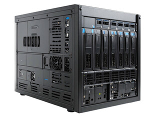 Close-up of a server, showing several hard drive bays, with internal components visible