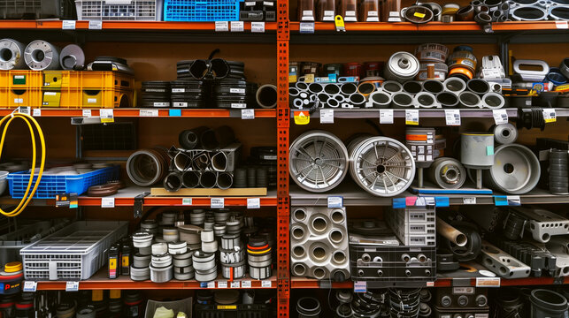 Highly organized industrial supply store shelves packed with various mechanical components.