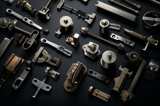 Different mechanical components, hinges, locks, and fasteners lying on a dark surface, creating an abstract industrial pattern