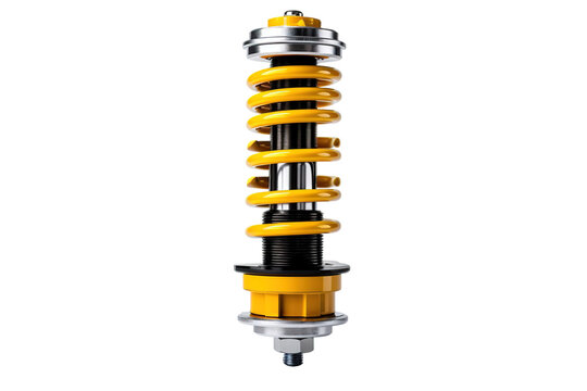 A Close-Up View of a Yellow and Silver Automotive Suspension Spring on a Clear PNG or White Background.