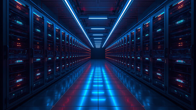 Futuristic server room with glowing neon lights and data storage units showing high tech infrastructure