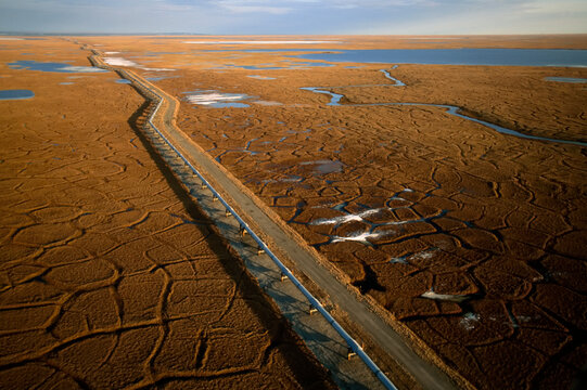 Aerial view of oil pipeline on tundra; North Slope, Alaska, United States of America