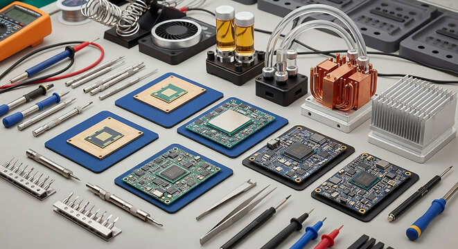 Neatly arranged tools for AI optimization including modular chips and cooling units