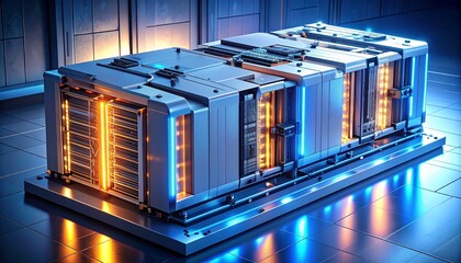 Modern server rack units in a clean, futuristic data center setting with ambient lighting