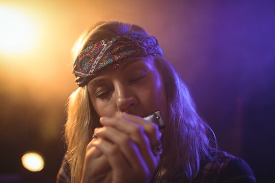 Beautiful female musician playing harmonica in nightclub