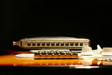 Vintage electric guitar with harmonica on black background