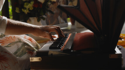Close up of Hands playing Harmonium or reed organ an Indian classical music instrument.