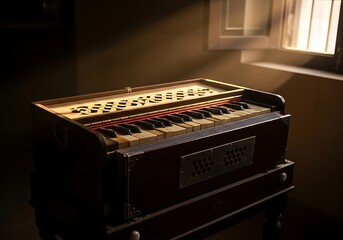 Indian harmonium, a traditional wooden keyboard instrument, close-up.  Bright colorful musical instrument on the patterned wrap