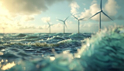 Offshore wind farms harnessing ocean power, selective focus, marine renewable energy, surreal, fusion, ocean backdrop