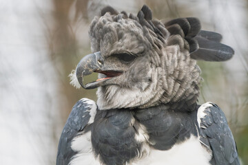 Profile view of a Harpy eagle (Harpia harpyja) with open beak showing a look of annoyance