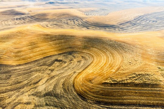 Tractors harvesting wheat fields in picturesque countryside landscape