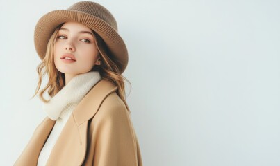 Young woman with stylish hat and coat poses against light background