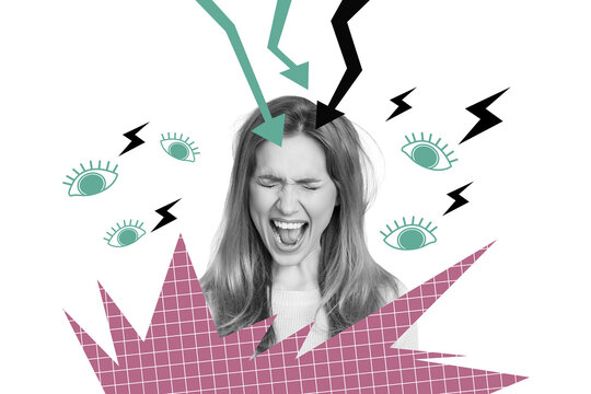Collage 3d image of pinup pop retro sketch of scream scared female bullying stressed panic attack unusual fantasy billboard comics