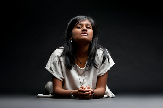 Portrait of a young brunette girl with a haughty look. Close-up, black background. piercing in the nose.