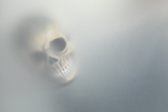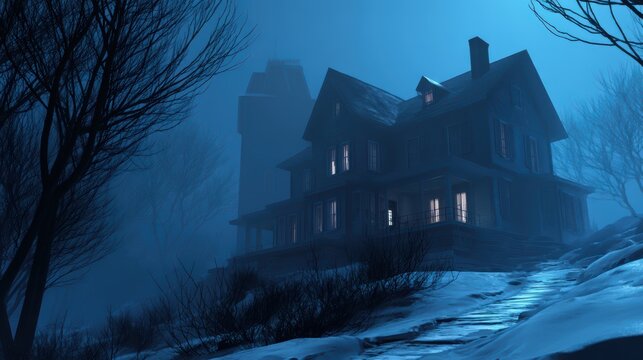 A dark, eerie house looms in a misty landscape, illuminated by faint lights, evoking a sense of mystery and suspense, with space for text