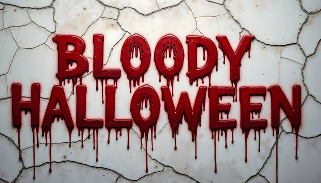 Bloody Halloween text dripping blood on cracked wall background
