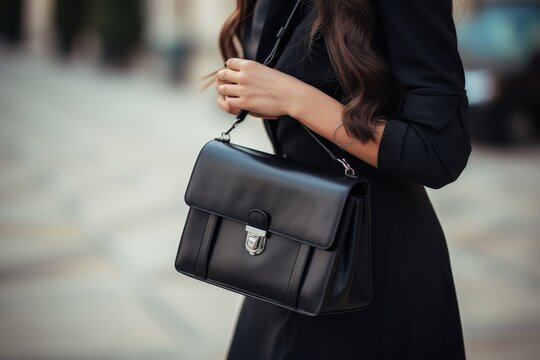Stylish woman in black dress and jacket holding a black leather bag