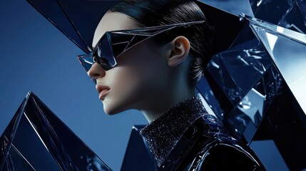 Futuristic Fashion: A Woman in Striking Sunglasses Amidst Geometric Reflections