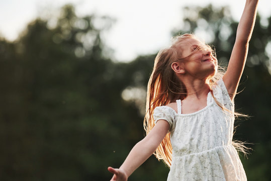 Particle view. Happy girl in white clothes have fun with kite in the field. Beautiful nature