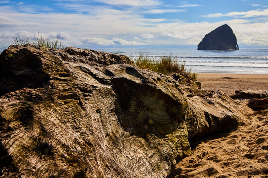 Haystack rock and the needles with beach grass in foreground on the Oregon coast at Cannon Beach