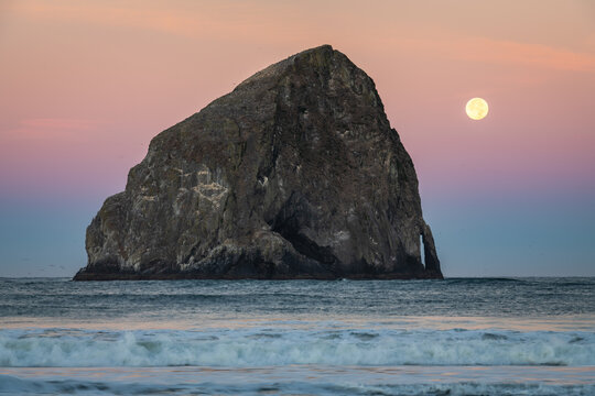 Full Moon setting behind Haystack Rock at Cape Kiwanda on the Oregon Coast as the sky fills with pink above the earth shadow at dawn