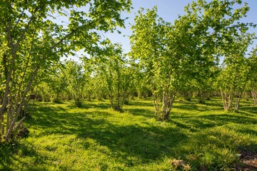 Scenic view of hazelnut tree plantations in the golden hour