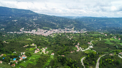 Aerial view of a village and forest in ordu city. hazelnut farm natural life