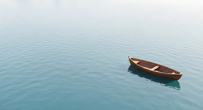 Serene wooden rowboat drifts gently on calm water under a hazy sky