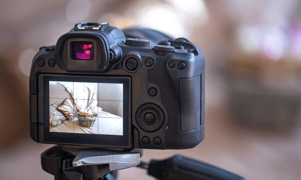 Close up of the screen of a professional digital camera on a tripod while shooting a home composition.