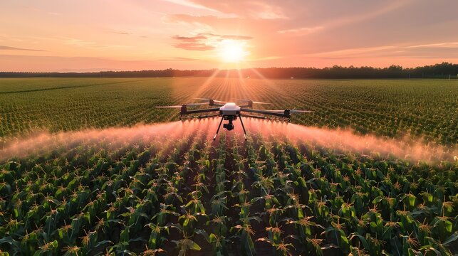 Aerial View of Drone Applying Precision Agriculture on Corn Field at Dusk