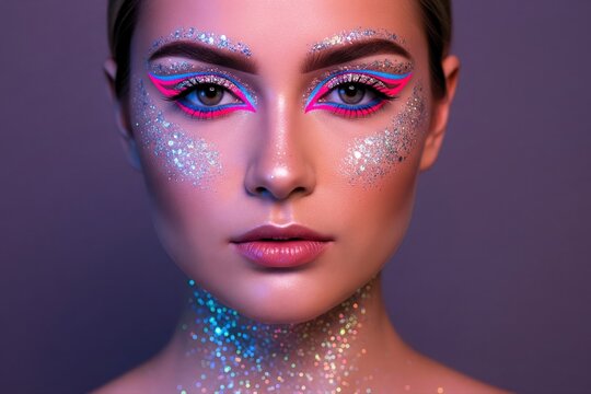 Neon Glitter Halloween Makeup. UV Face Portrait.