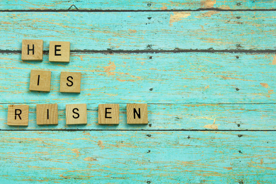 wooden christian cross with crown of thorns and text He is risen. Calligraphy lettering