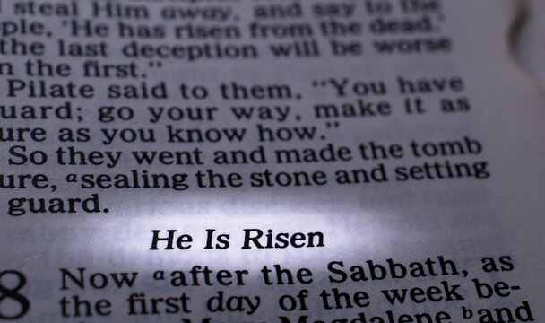 powerful message 'He is Risen' with an image of the crucifixion at sunrise, capturing the divine light and spiritual significance.